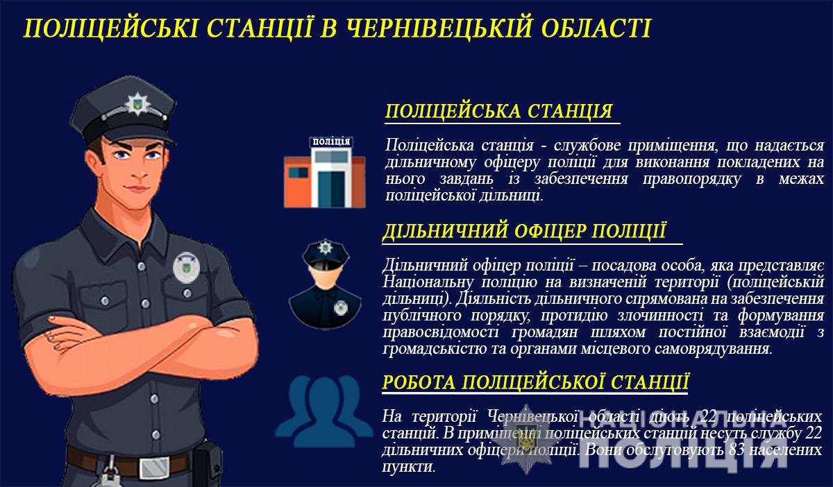 Одна з них входить до складу Центру безпеки, 16 поліцейських станцій обслуговують об’єднані територіальні громади та ще 5 функціонують на території сільських рад в районах Чернівецької області.