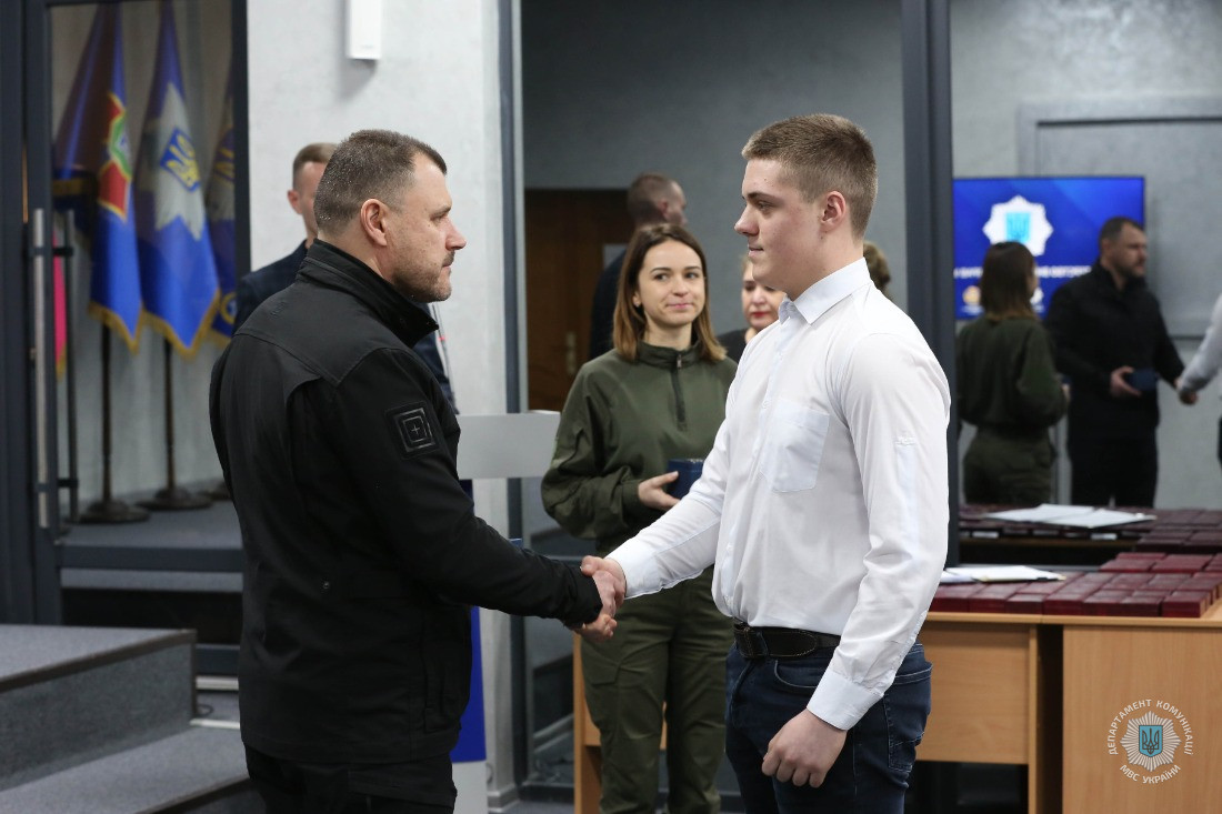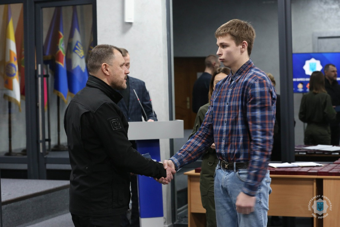 «Сьогодні тут присутні чотири хлопці з міста Бровари. Коли, два тижні тому, гелікоптер впав на дитячий садок, вони були поруч і першими почали виводити дітей і вихователів із будівлі. Цим хлопцям по 17 — 18 років, але вони вже справжні захисники майбутнього нашої держави», — зазначив виконувач обов’язків міністра внутрішніх справ України Ігор Клименко.