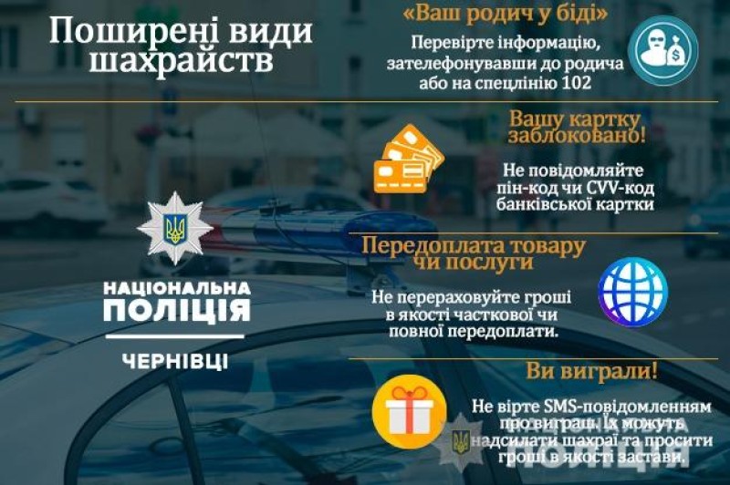 Протягом минулої доби на спецлінію «102» надійшло чотири повідомлення від жителів Чернівецького, Вижницького та Дністровського районів про те, що невідомі особи незаконно заволоділи їхніми коштами. При цьому порушники використовували різні схеми виманювання грошей. Відповідно до санкції статті, за вказані дії шахраям загрожує до трьох років обмеження волі.