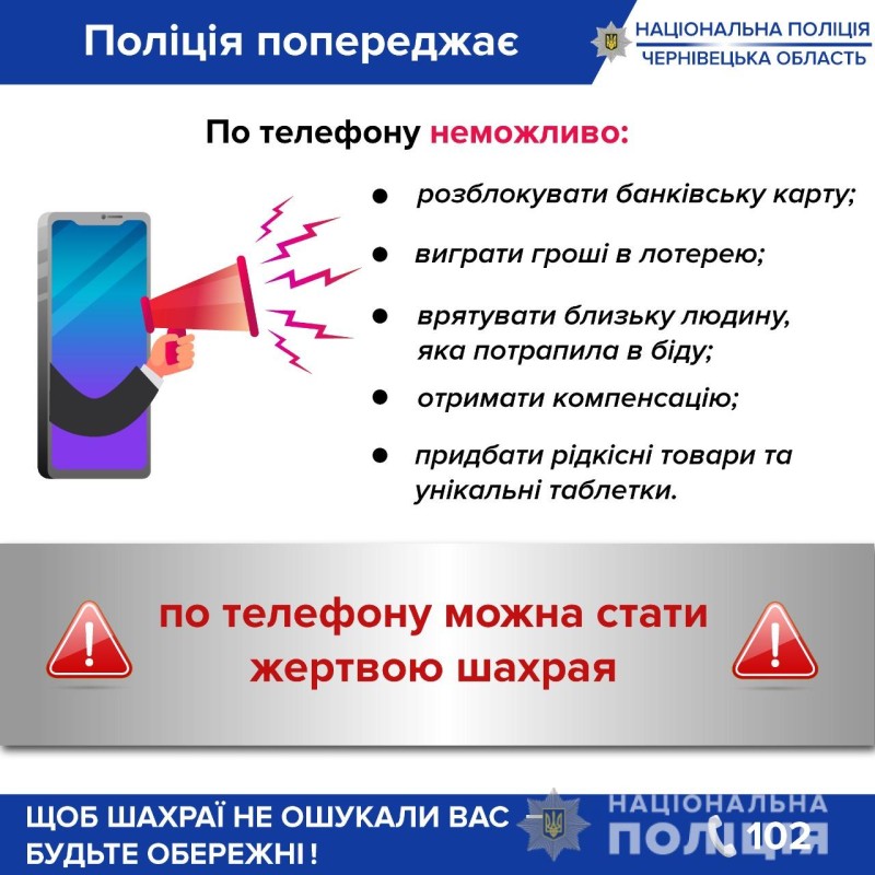 Щодня громадяни стають жертвами шахраїв, які, вигадуючи нові схеми виманювання грошей, ошукують людей. Поліцейські вкотре звертаються до буковинців з проханням перевіряти платформи, через які здійснюєте покупки-онлайн, не переходити за сумнівними посиланнями, не надсилати гроші невідомим особам, не надавати нікому свої персональні дані. Усі ці необдумані дії можуть призвести до втрати великої суми коштів.