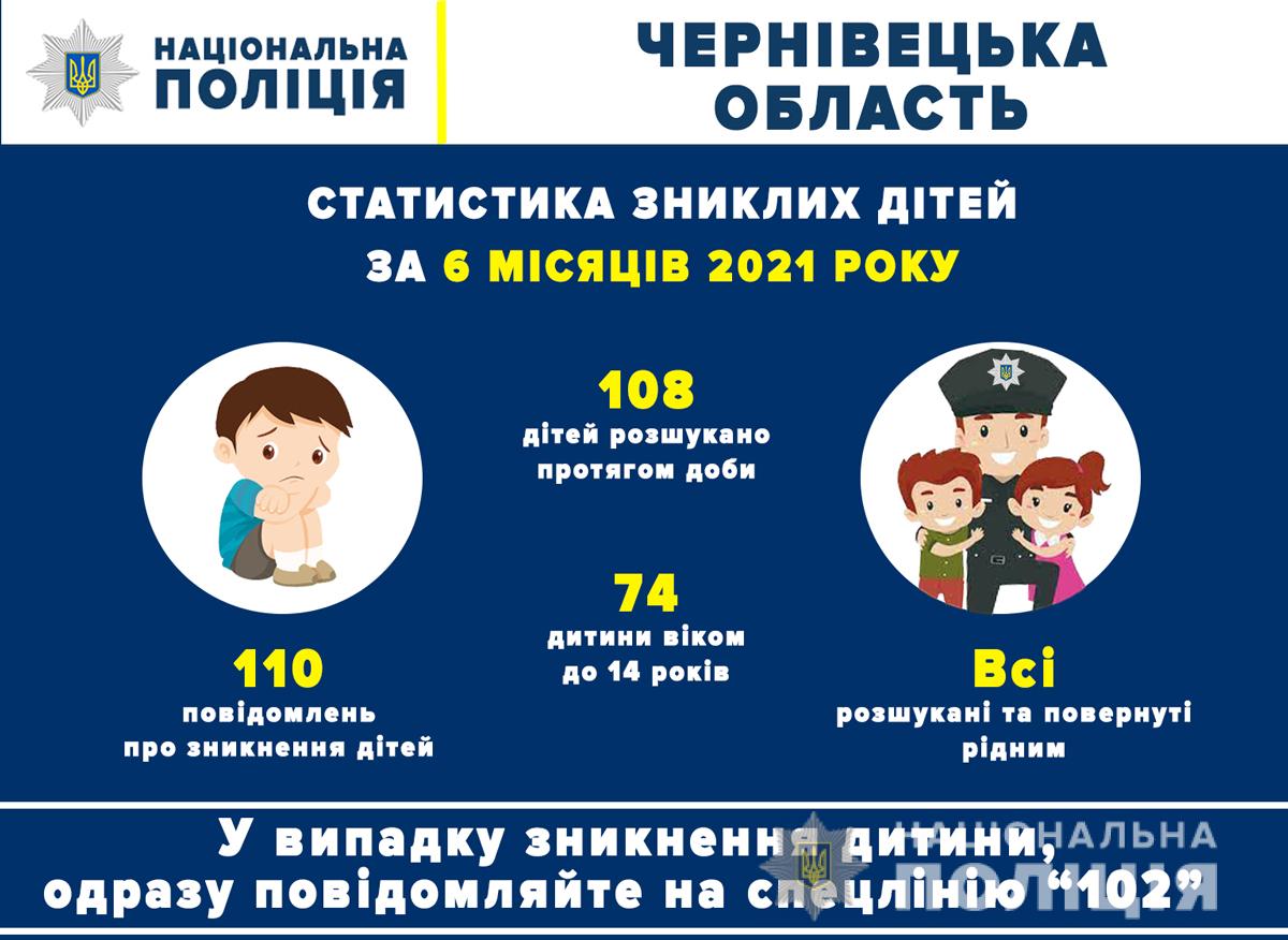 За цей період до поліції надійшло 110 повідомлень про зникнення неповнолітніх буковинців, які самовільно вийшли з дому та не повернулися. Поліцейські оперативно відреагували на ці звернення та відшукали всіх зниклих дітей, 98% з них – протягом доби. Здебільшого їх вік становить до 14 років.