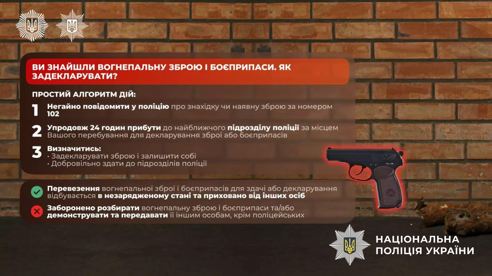 Нагадаємо, щоб задекларувати знайдену вогнепальну зброю, необхідно звернутись на спецлінію поліції 102 або до територіального підрозділу поліції: