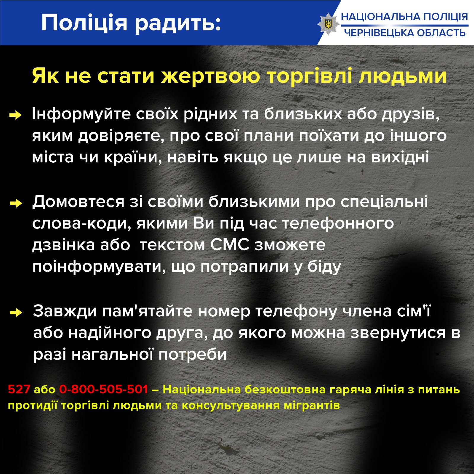 В Україні існує безкоштовна національна «гаряча лінія» з протидії торгівлі людьми та консультування мігрантів – 527 або 0 800 505 501.