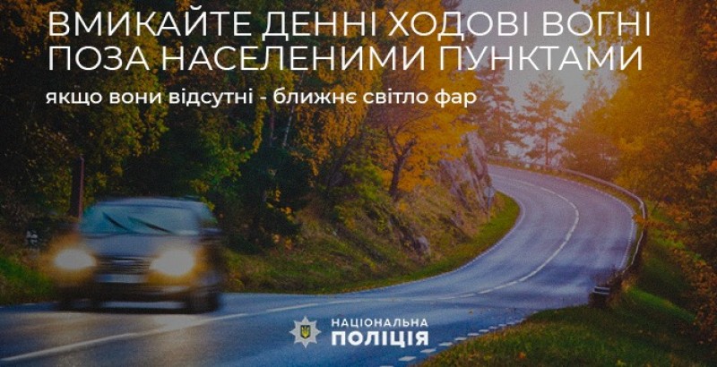На заміських дорогах поза населеними пунктами всі механічні транспортні засоби зобов'язані рухатися у світлий час доби з увімкненими денними ходовими вогнями або з ближнім світлом фар. Поліцейські інформують громадян, що вимога пункту 9.8 Правил дорожнього руху діє постійно, є обов’язковою для виконання і покликана підвищити безпеку дорожнього руху на затемнених ділянках дороги.