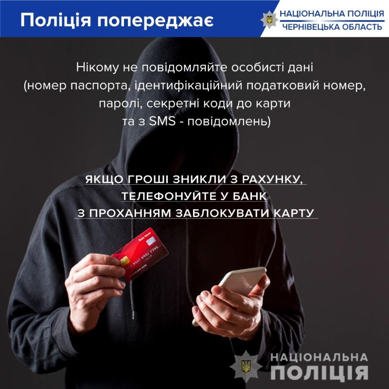 За аналогічною схемою аферисти ошукали 43-річного жителя Вікнянської громади. Чоловік розповів поліцейським, що йому зателефонував невідомий та представився працівником банку. Псевдобанкір увійшов в довіру буковинця, під приводом блокування карткового рахунку, дізнався всі необхідні персональні дані. Після розмови з аферистом, заявник отримав сповіщення про зняття готівки в розмірі 49 тисяч гривень.