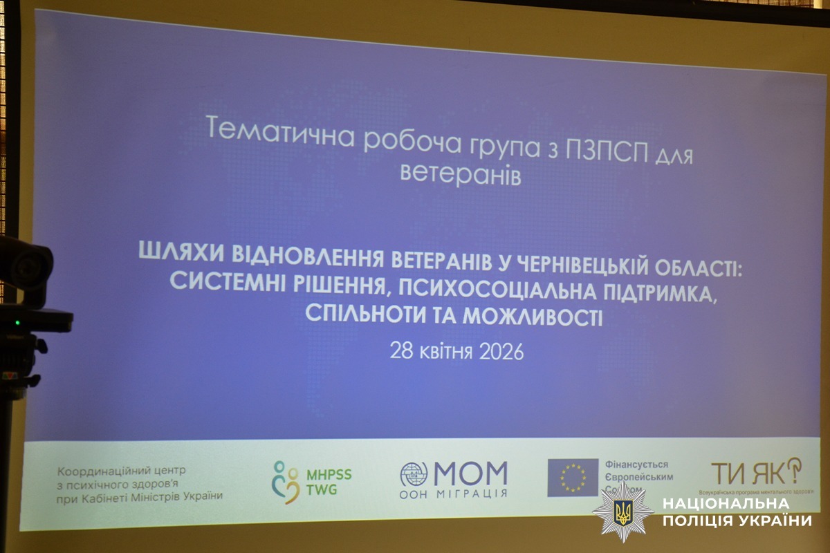 28 квітня у Чернівцях відбулося засідання робочої групи для ветеранів «Шляхи відновлення ветеранів у Чернівецькій області: системні рішення, психосоціальна підтримка, спільноти і можливості». Від поліції Буковини участь у заході взяв помічник начальника ГУНП з ветеранських питань Денис Стратійчук.