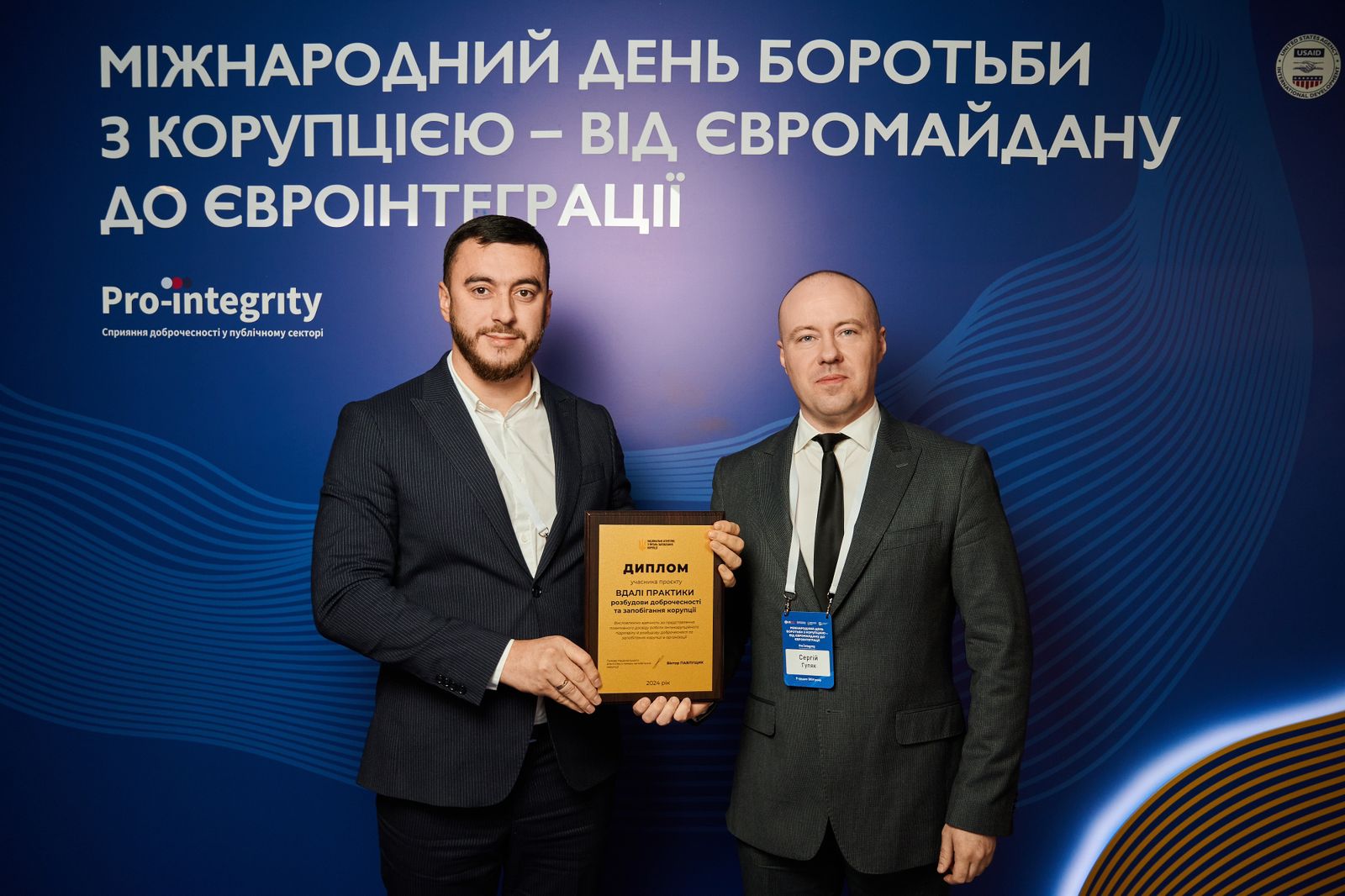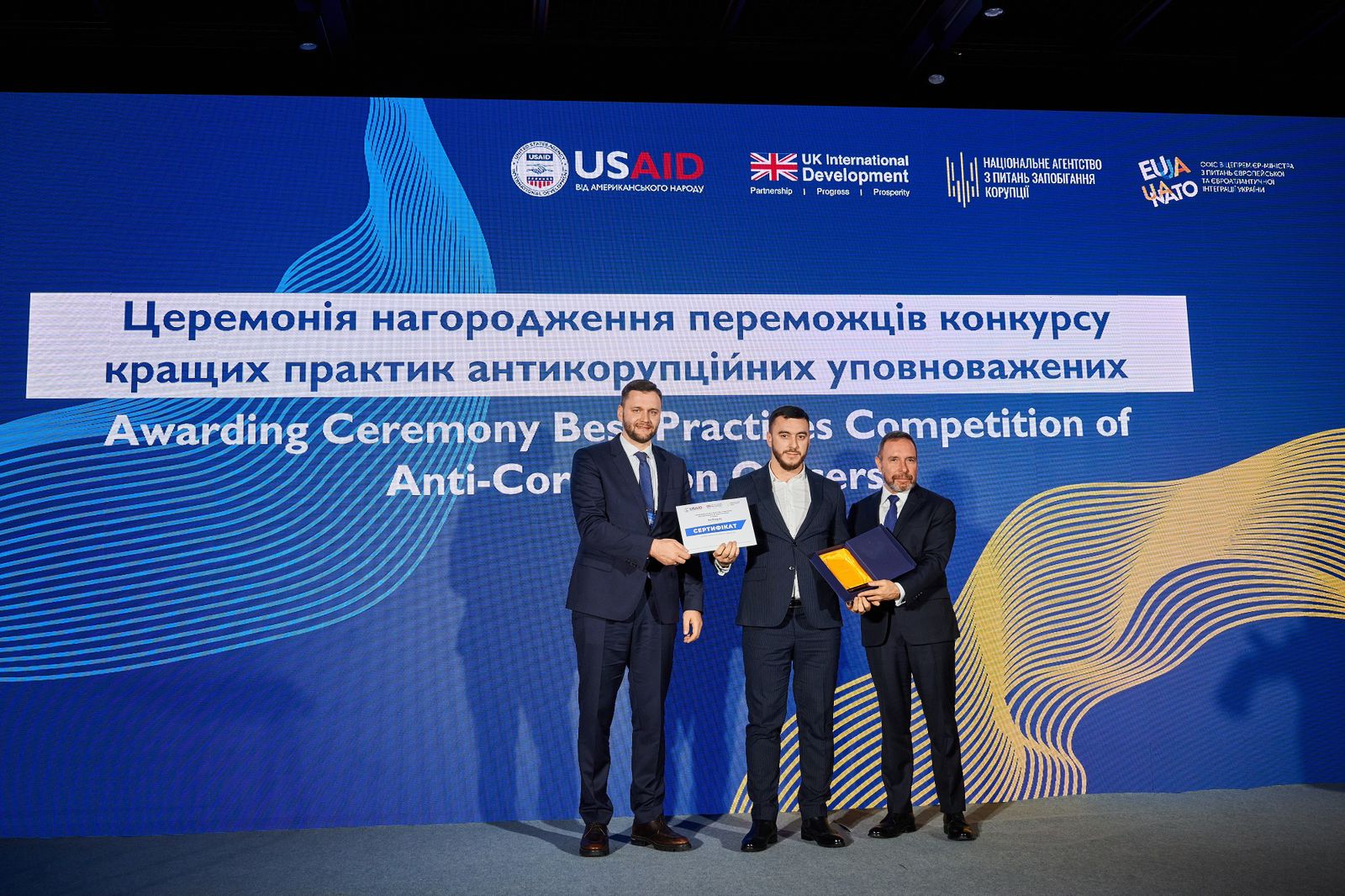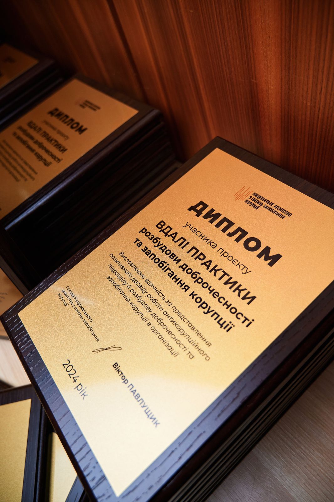 Наприкінці форуму нагороджено переможців конкурсу кращих практик антикорупційних уповноважених. Позитивний досвід антикорупційного підрозділу Національної поліції України відзначено дипломом за вдалі практики розбудови доброчесності та запобігання корупції.