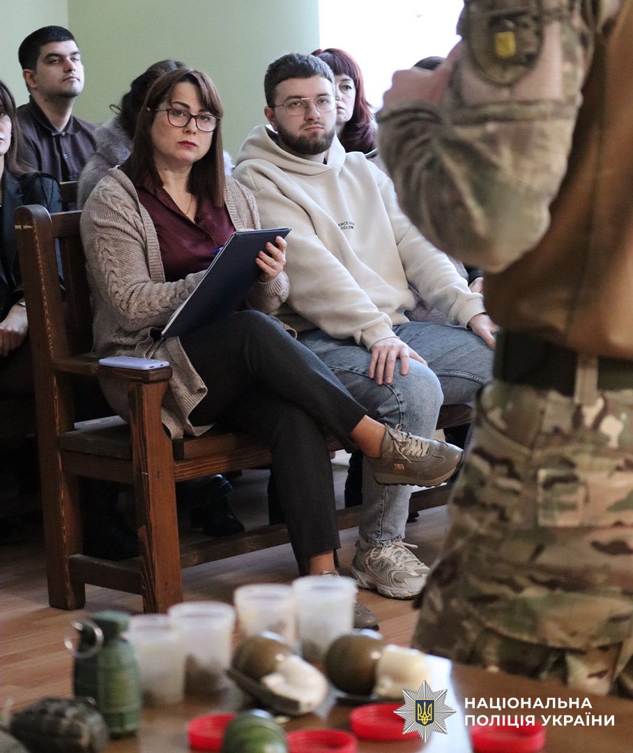 Своєю чергою вибухотехніки поліції Буковини поінформували про те, як варто реагувати на будь-яку небезпеку та довели алгоритм дій щодо забезпечення власної безпеки при погрозі застосування чи застосування злочинцями вибухових пристроїв, а також нагадали як діяти у разі надходження повідомлення про загрозу вибуху. Зокрема, мова йде про дотримання особистої безпеки і порядок дій у разі виявлення підозрілих предметів Поліцейські наголосили: найперше – не можна підходити до небезпечної знахідки та у жодному разі не чіпати її. Натомість необхідно одразу повідомити про сумнівну знахідку поліцію, зателефонувавши на спецлінію «102».