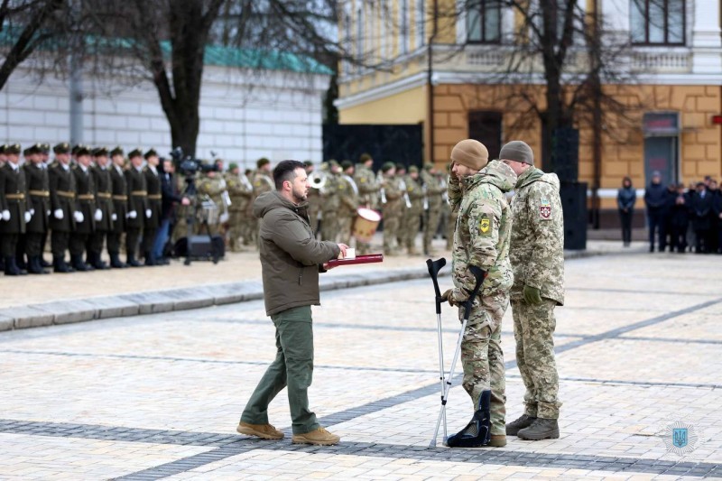 Сьогодні, 24 лютого, на Софійській площі Володимир Зеленський нагородив українських захисників, зокрема працівників системи МВС. Нагороди кількох співробітників отримали їх рідні.