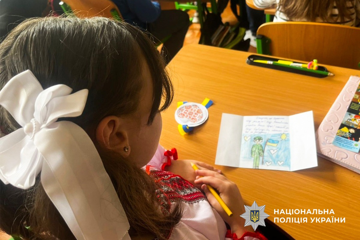 Особливу увагу правоохоронці приділили важливій ролі українських героїв на сьогодні у період війни. На знак вдячності за захист нашої землі від ворога діти власноруч підготували для наших оборонців листівки, які в подальшому будуть їм передані.