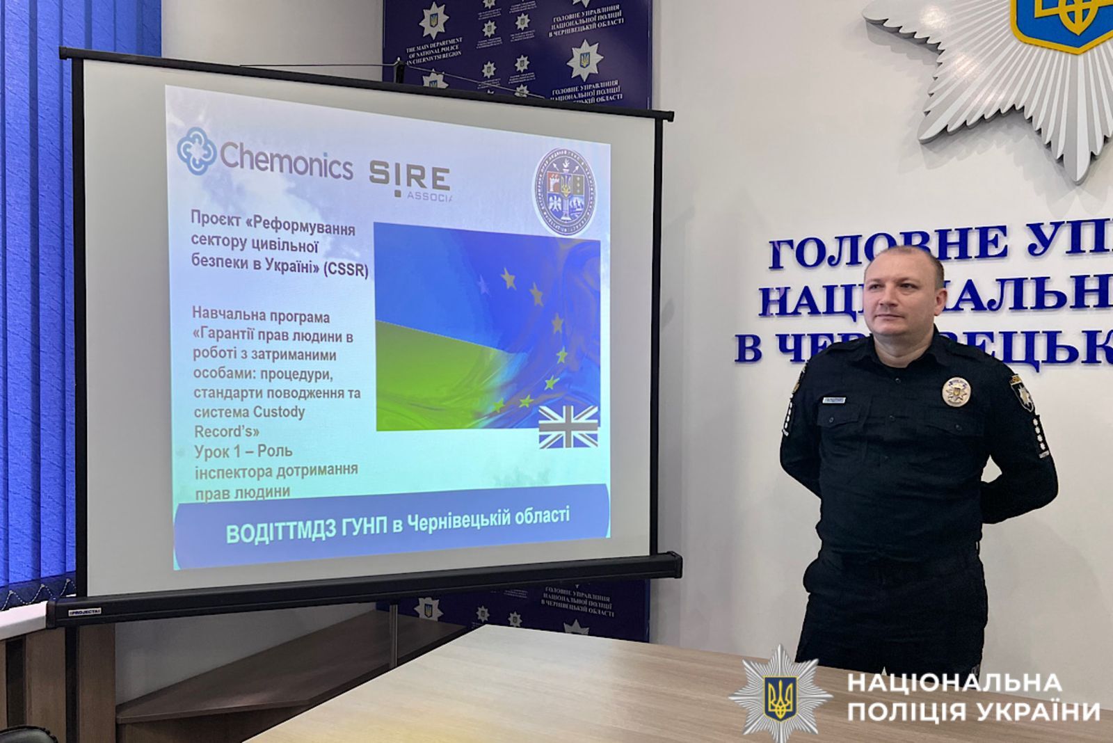 Сьогодні, 16 березня, для інспекторів дотримання прав людини територіальних підрозділів поліції Буковини і поліцейських, які тимчасово виконують їх обов’язки, відбувся навчальний тренінг на тему: «Гарантії прав людини в роботі з затриманими особами: процедури, стандарти поводження та система Custody Record’s». Захід відбувся в рамках проєкту «Реформування сектору цивільної безпеки в Україні» (СSSR).