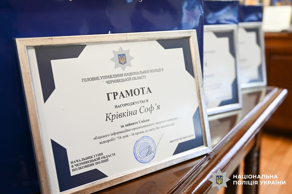 Свідомість і небайдужість до важливої глобальної проблеми: начальник поліції Буковини відзначив юних переможців конкурсу відеоробіт «16 днів – 16 кроків до світу без насильства»