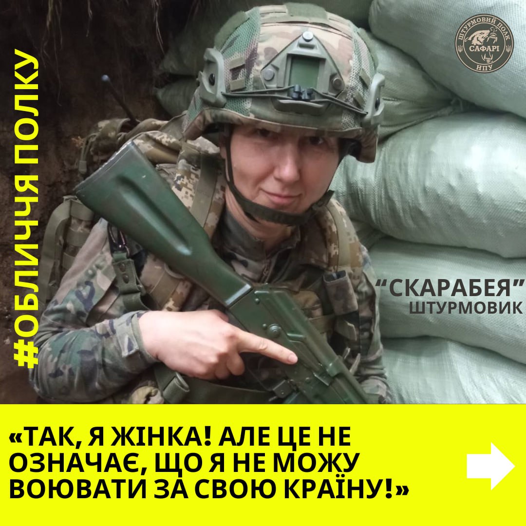 «Так, я жінка! Але це не означає, що я не можу воювати за свою країну!», — бійчиня штурмового полку «Сафарі» бригади Нацполіції «Лють» Скарабея