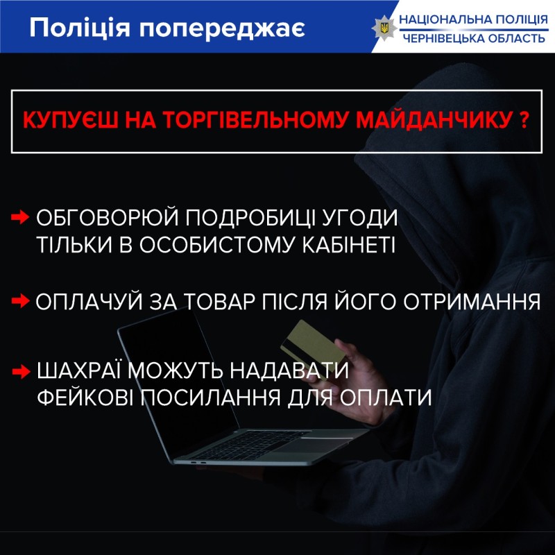 Правоохоронці нагадують буковинцям про необхідність перевіряти інформацію про Інтернет-магазини перед здійсненням покупки. Не здійснюйте передоплати за товари та не користуйтеся сумнівними сайтами оголошень.