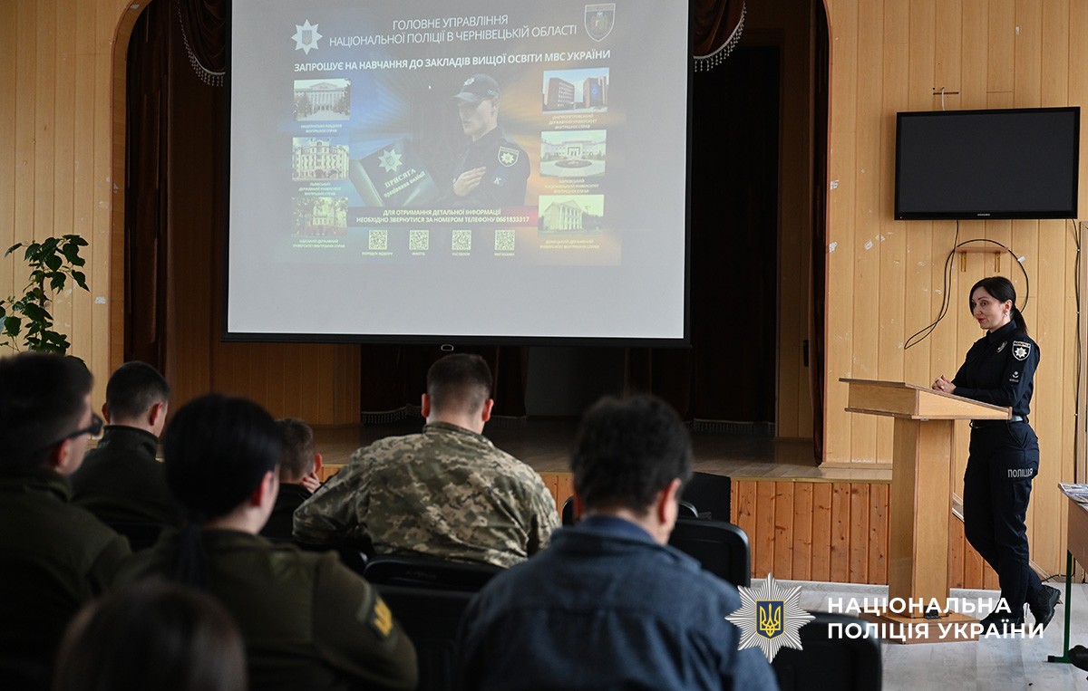 Під час заходу працівники сектору організації відбору Управління кадрового забезпечення поліції Буковини детально ознайомили вихованців Чернівецького військово-спортивного ліцею із умови вступу до відомчих закладів освіти, розповіли про перспективи працевлаштування після завершення навчання та надали перелік спеціальностей і закладів МВС зі специфічними умовами навчання.