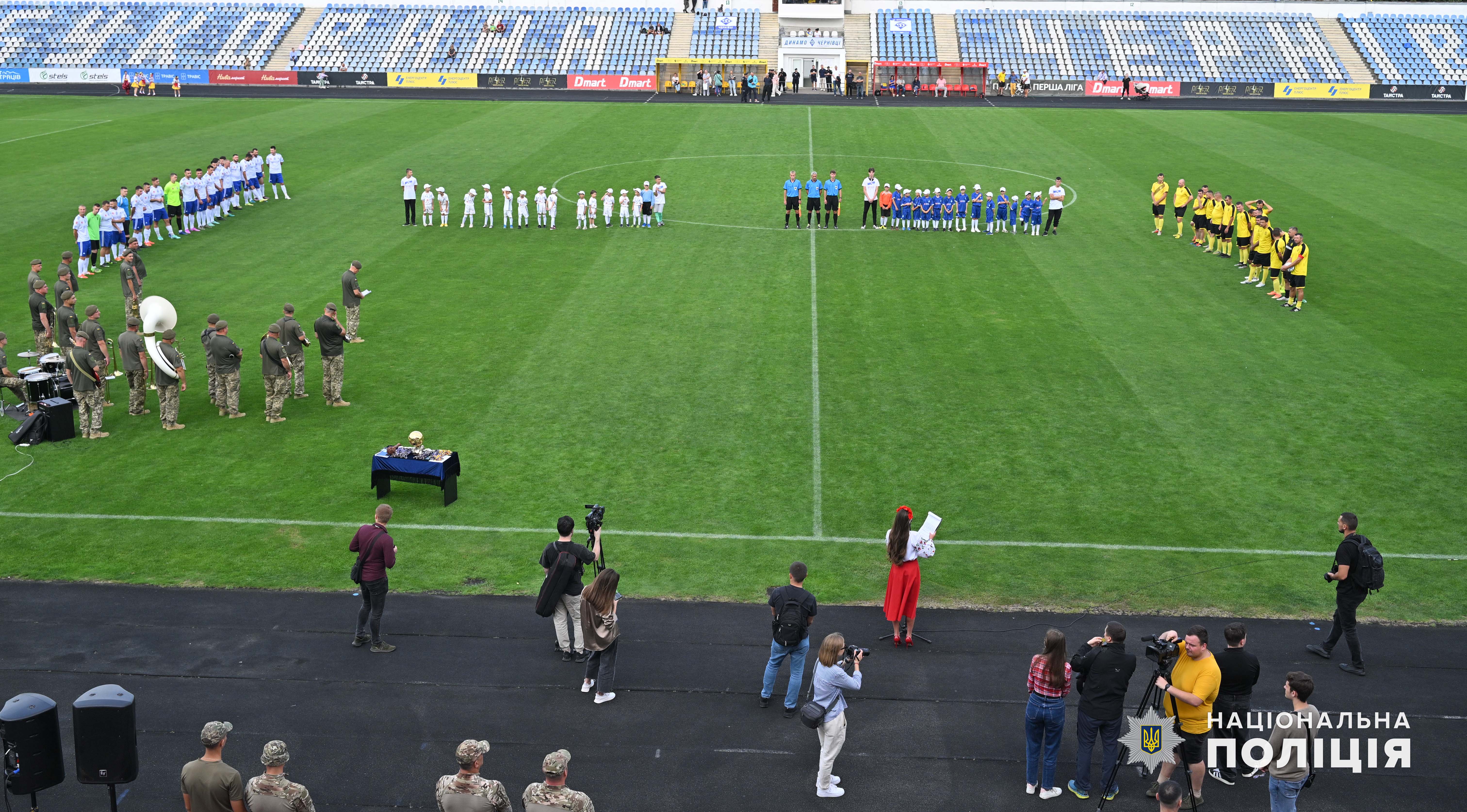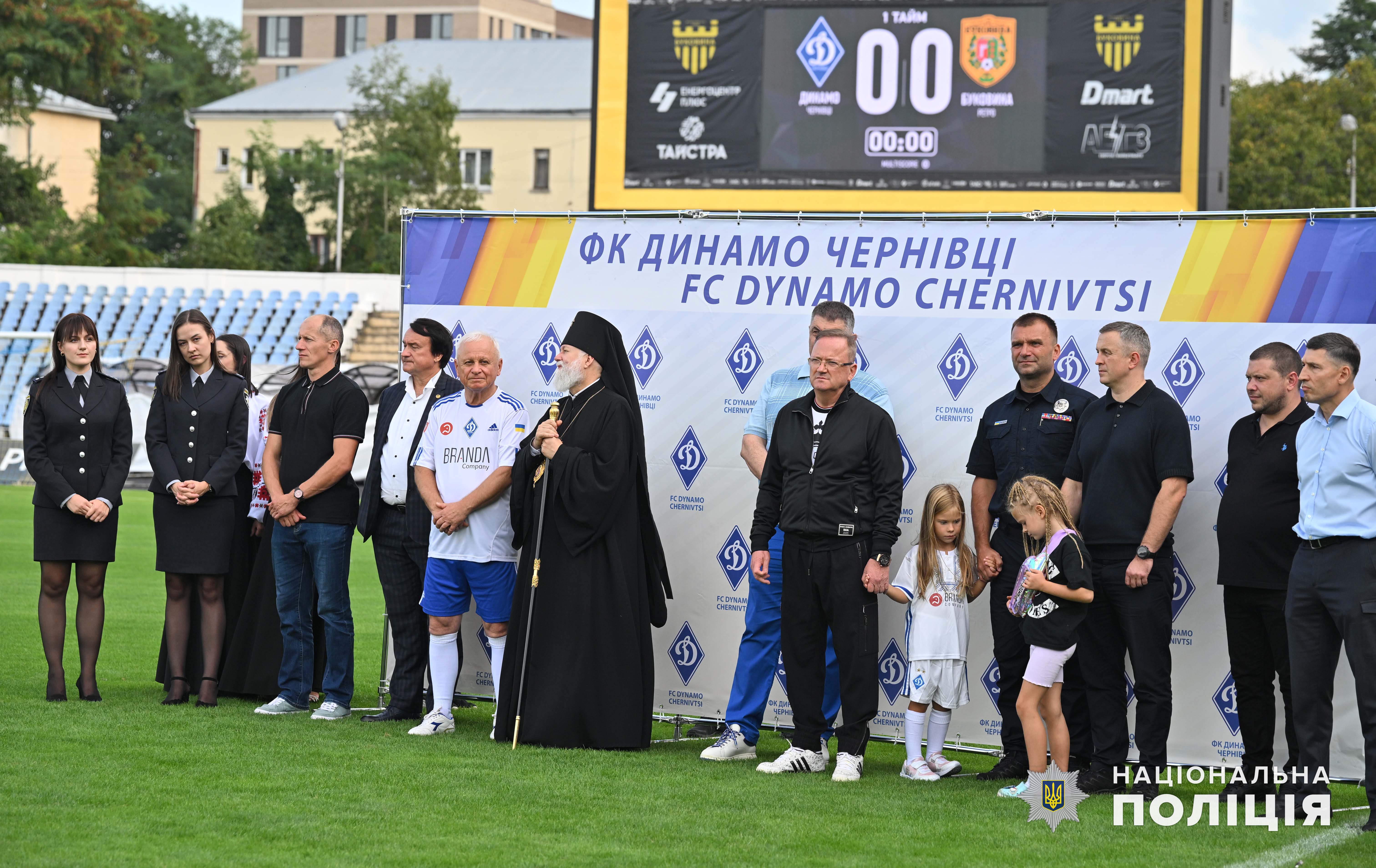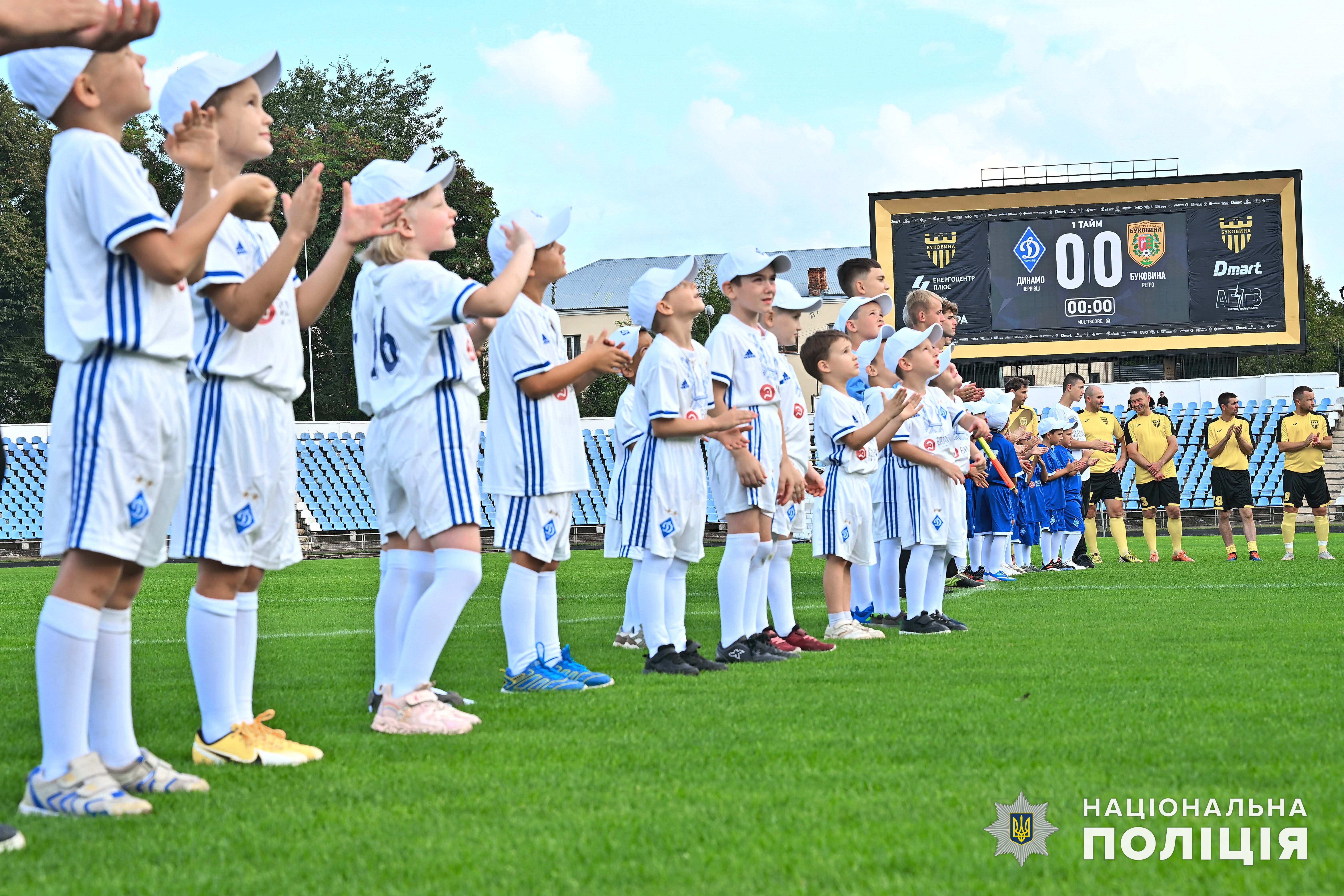 Після цього на центральну спортивну арену Чернівців вийшли учасники матчу та наймолодші буковинські динамівці у супроводі капітана команди «Динамо» Чернівці, начальника ГУНП в Чернівецькій області Віктора Нечитайла, який разом з колегами ініціював створення ДЮФШ.