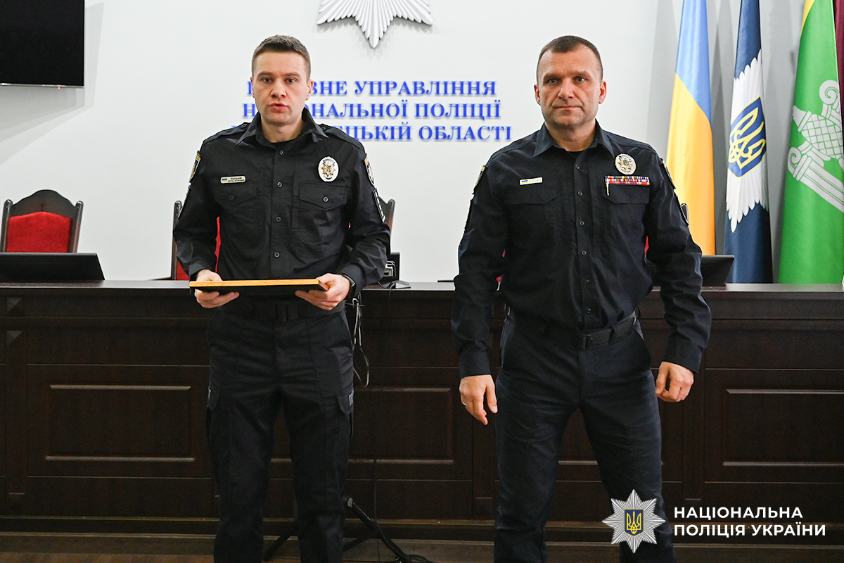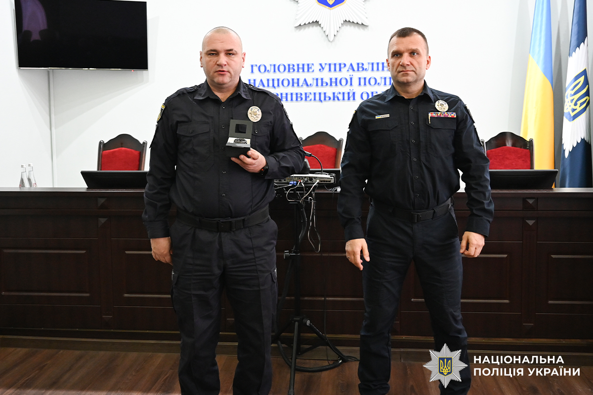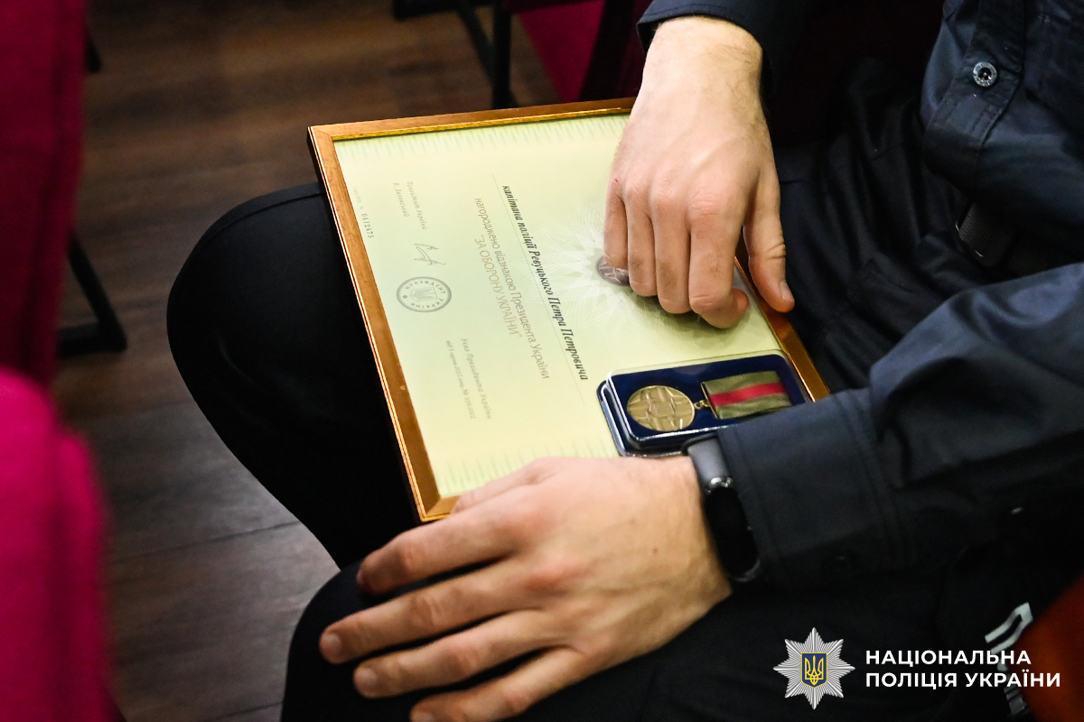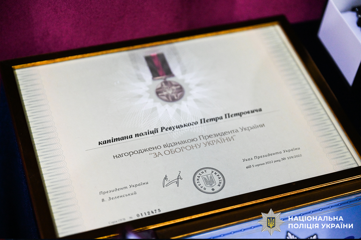 За успішне й сумлінне виконання службових обов’язків в умовах воєнного стану, високий професіоналізм, стійкість і відданість Присязі, активну участь у забезпеченні публічної безпеки та правопорядку, зміцнення єдності Українського народу, а також з нагоди відзначення у 2026 році Дня Соборності України полковник поліції Віктор Нечитайло вручив капітану поліції старшому інспектору управління превентивної діяльності ГУНП Петру Ревуцькому відзнаку Президента України «За оборону України».