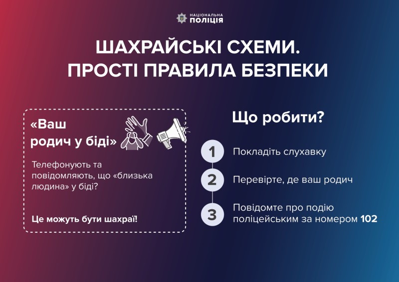 • не називайте невідомому імена своїх близьких. Для перевірки слід попросити того, хто представився правоохоронцем чи лікарем, назвати прізвище, ім'я та дату народження затриманого або постраждалого родича;