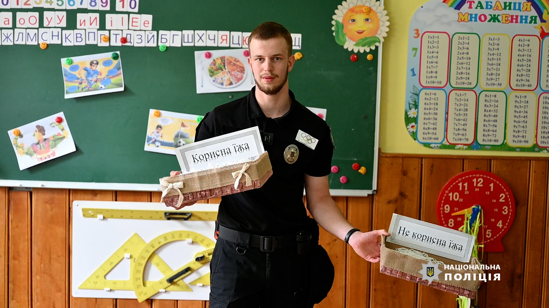 Лейтенант поліції Павло Кайдаш для учнів молодших класів заздалегідь підготував дві корзинки із надписами про корисну і некорисну їжу. В ігровій формі діти, обираючи малюнки з продуктами харчування, повинні були самостійно визначити, до якої корзинки їх покласти, при цьому аргументувати, чому той чи інший продукт корисний. Учні на відмінно виконали поставлене завдання та проявили зацікавленість у проведенні таких акцій і надалі.