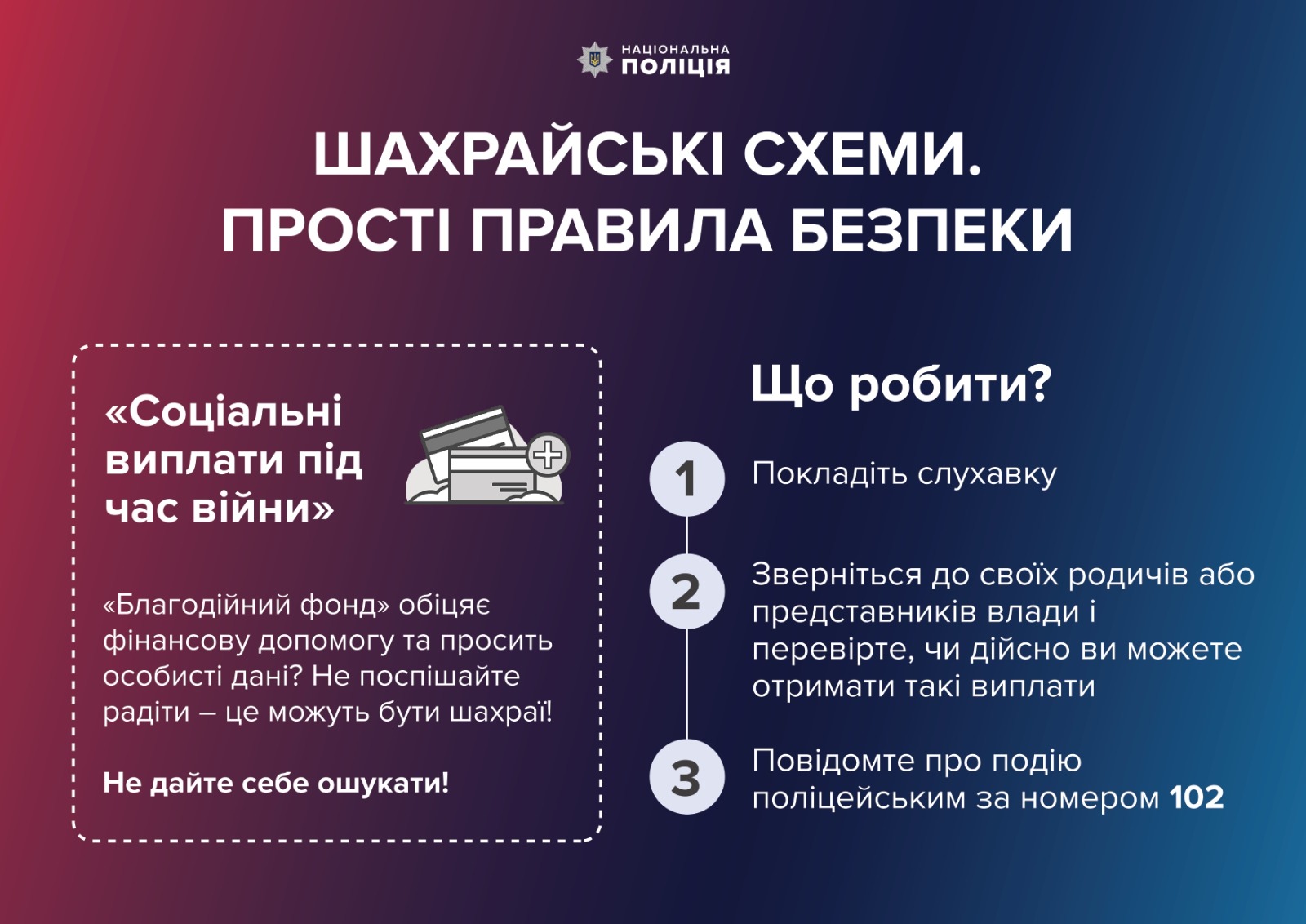 * не довіряйте інформації про отримання грошової допомоги в соціальних мережах.