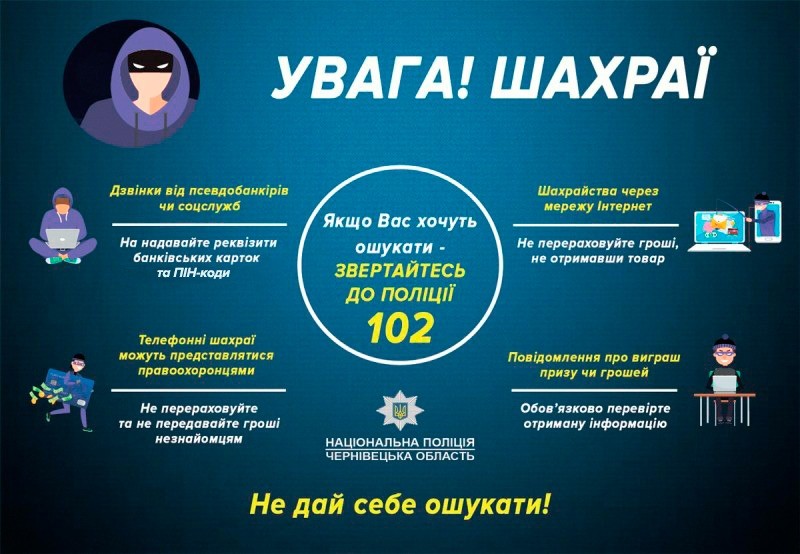 13 серпня з повідомленням про шахрайство до Чернівецького райуправління поліції звернувся 48-річний місцевий житель. Заявник розповів поліцейським, що його зателефонував невідомий, який представився працівником банку. Псевдобанкір, під приводом повернення коштів на картку, дізнався персональні дані заявника та перерахував з банківського рахунку чернівчанина 10 тисяч гривень.