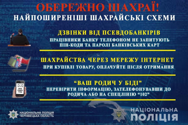 Поліцейські Буковини нагадують: у випадку дзвінка «Ваш родич у біді», перш за все спробуйте зв’язатися з тим хто потребує допомоги, або зателефонуйте у поліцію та перевірте інформацію. В жодному випадку не перераховуйте та не передавайте гроші незнайомцям!