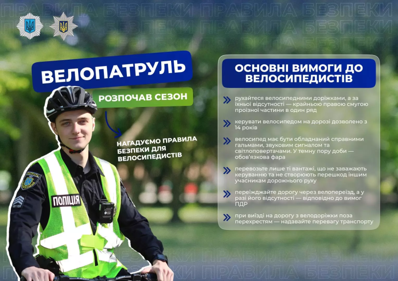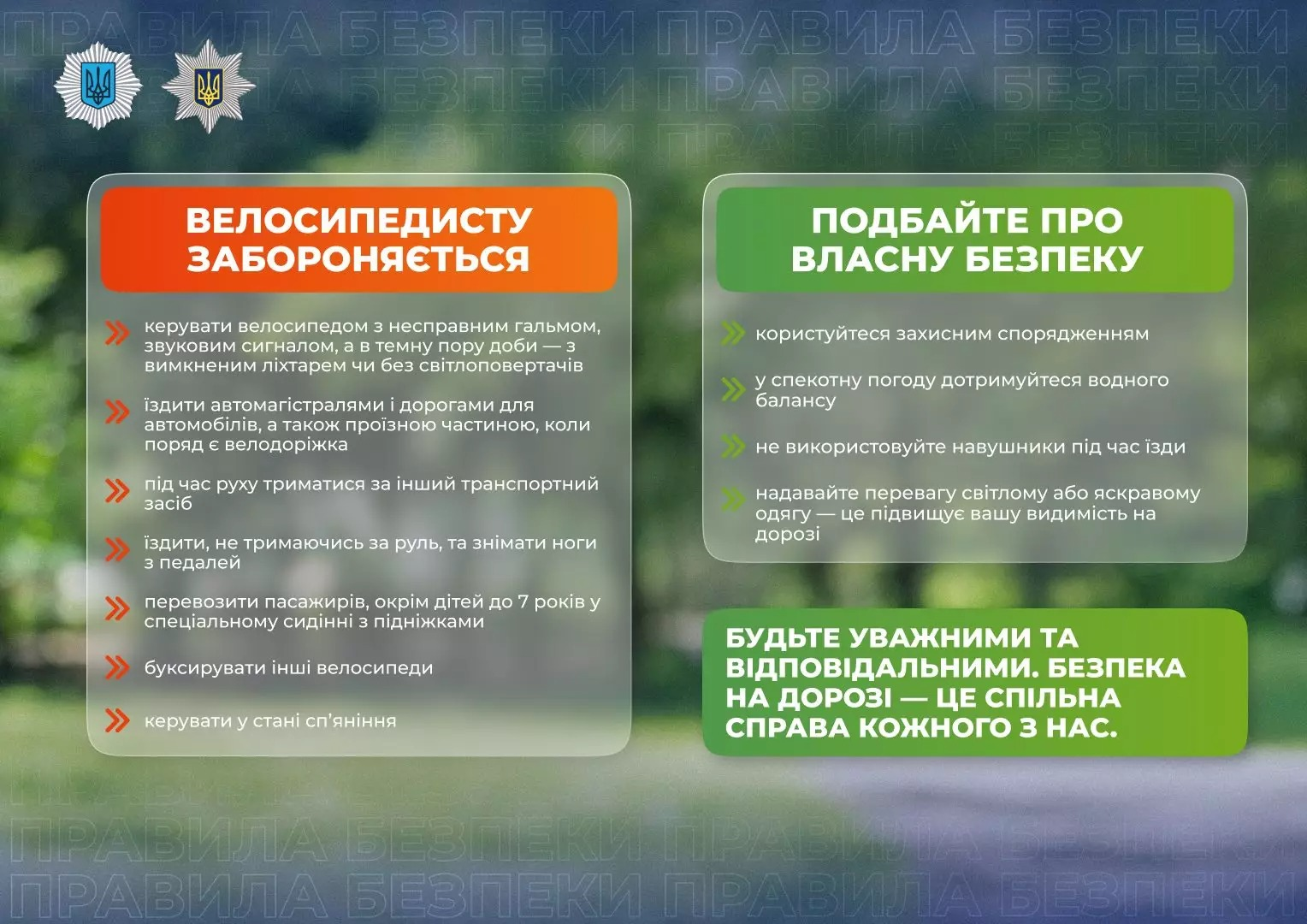 Велосипедисти — це учасники дорожнього руху, які повинні дотримуватися ПДР. Декілька основних правил:
