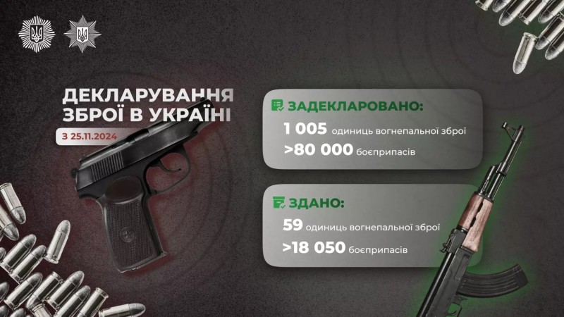За цей період в органах Національної поліції українцями було задекларовано вже більше 1 тис. одиниць вогнепальної зброї (з них понад 350 автоматів та 470 гладкоствольних рушниць), а також понад 80 тис. боєприпасів.