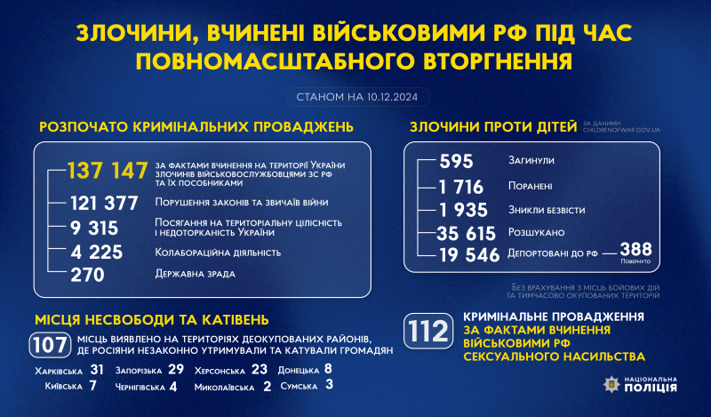 З початку повномасштабного вторгнення росії в Україну слідчі Національної поліції України розпочали 137 147 кримінальних проваджень за фактами вчинення на території України злочинів військовослужбовцями збройних сил російської федерації та їхніми пособниками.