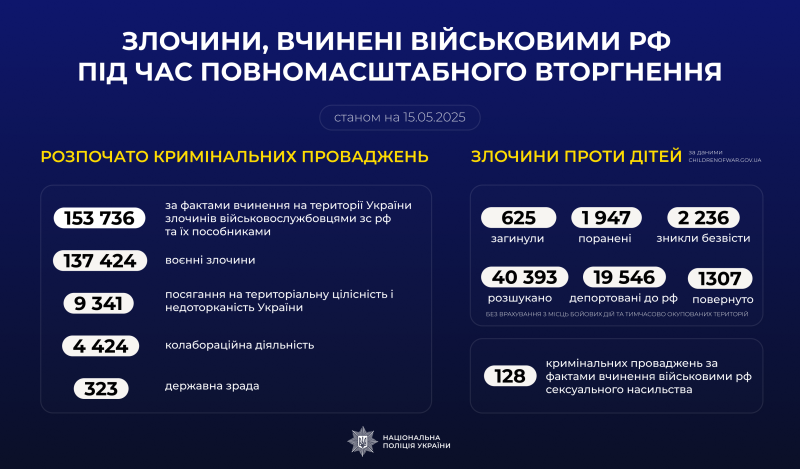 З початку повномасштабного вторгнення росії в Україну слідчі Національної поліції України розпочали 153 736 кримінальних проваджень за фактами вчинення на території України злочинів військовослужбовцями збройних сил російської федерації та їхніми пособниками.