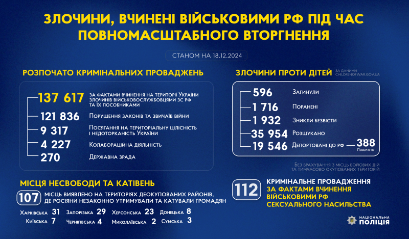 З початку повномасштабного вторгнення росії в Україну слідчі Національної поліції України розпочали 137 617 кримінальних проваджень за фактами вчинення на території України злочинів військовослужбовцями збройних сил російської федерації та їхніми пособниками.