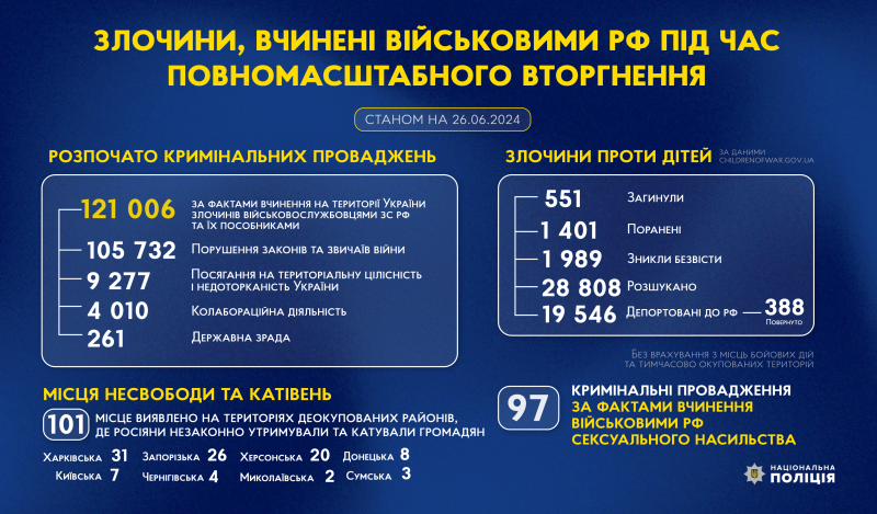З початку повномасштабного вторгнення росії в Україну слідчі Національної поліції України розпочали 121 006 кримінальних проваджень за фактами вчинення на території України злочинів військовослужбовцями збройних сил російської федерації та їхніми пособниками.
