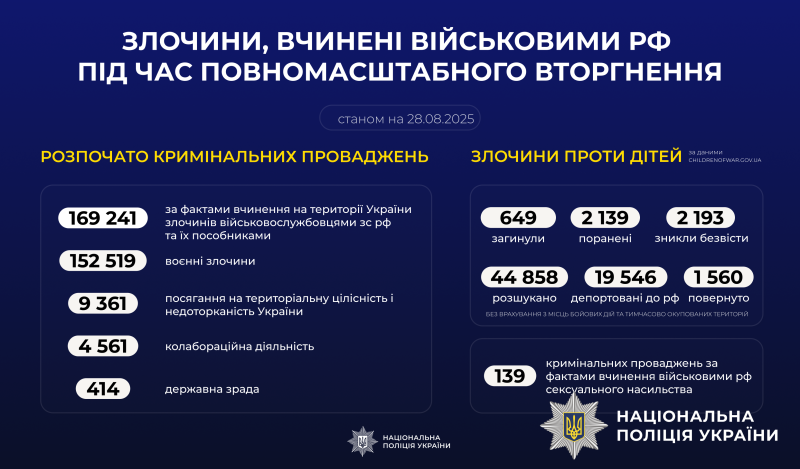 З початку повномасштабного вторгнення росії в Україну слідчі Національної поліції України розпочали 169 241 кримінальних проваджень за фактами вчинення на території України злочинів військовослужбовцями збройних сил російської федерації та їхніми пособниками.